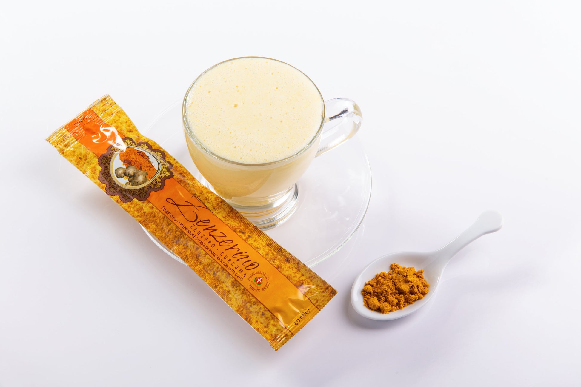 Scheda technica del prodotto: sciroppo per la preparazione di bevanda analcolica con latte caldo. Ingredienti: acqua, zucchero,estratto di zenzero (29 %), (acqua, zenzero), curcuma(0,3%), aroma, Pastorizzato.
